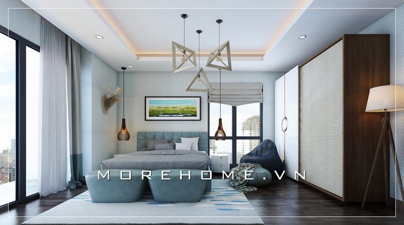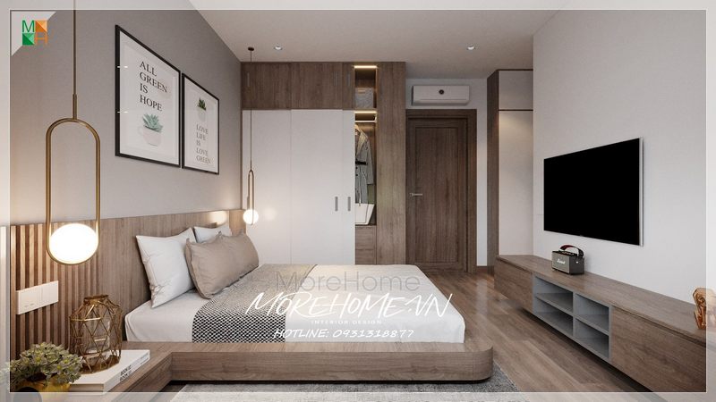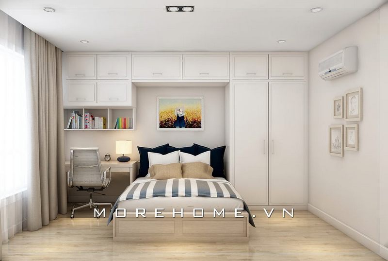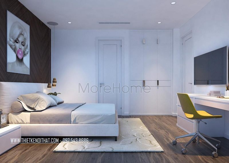 Thiết kế nội thất phòng ngủ gỗ công nghiệp nhẹ nhàng kết hợp tone màu trắng chủ đạo mang lại không gian nghỉ ngơi yên tĩnh mà không kém phần sang trọng
