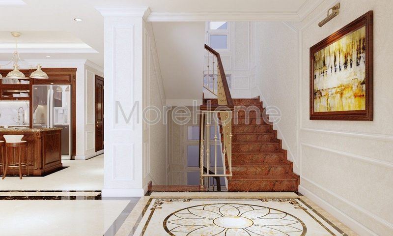 Cầu thang gỗ kết hợp phên sắt được mạ vàng hoàng gia trong không gian nguy nga của biệt thự, nhà phố