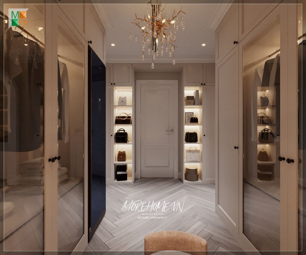 Với phòng ngủ có diện tích lớn như phòng ngủ master pethouse, biệt thự, nhà phố, có thể sử dụng một hệ thống phòng thay đồ với tủ quần áo để phân chia riêng khu vực thay đồ và khu vực nghỉ ngơi như trong mẫu thiết kế phòng ngủ này