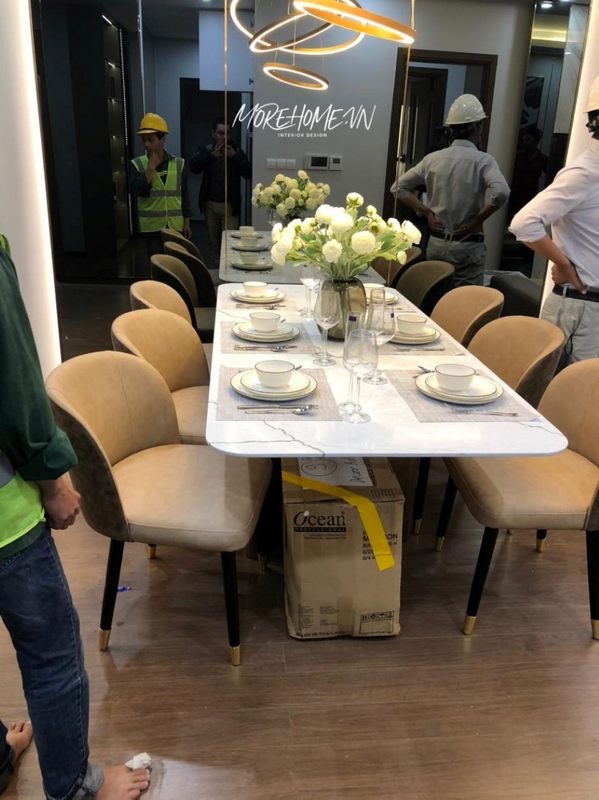 Ấn tượng mẫu bàn ăn 8 ghế bọc da chân gỗ óc chó cao cấp mang phong cách tân cổ điển rất phù hợp với không gian phòng ăn biệt thự cao cấp.