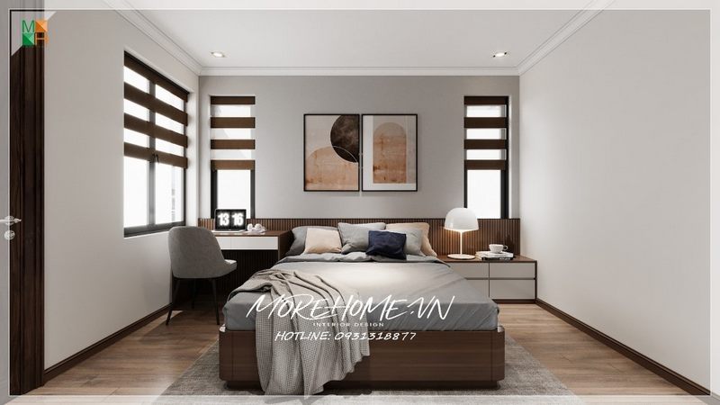 Nội thất phòng ngủ chung cư hiện đại với chất liệu chủ đạo là gỗ, phần cửa sổ được thiết kế với khoảng cách lớn