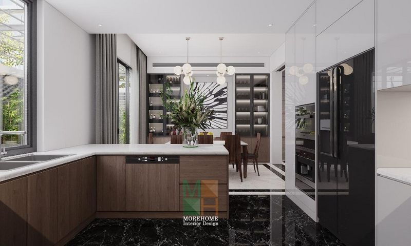 Không gian bếp rộng thoáng với thiết kế mở châu Âu được khéo léo kết hợp với bàn đảo bếp tránh khí đi thẳng vào phòng