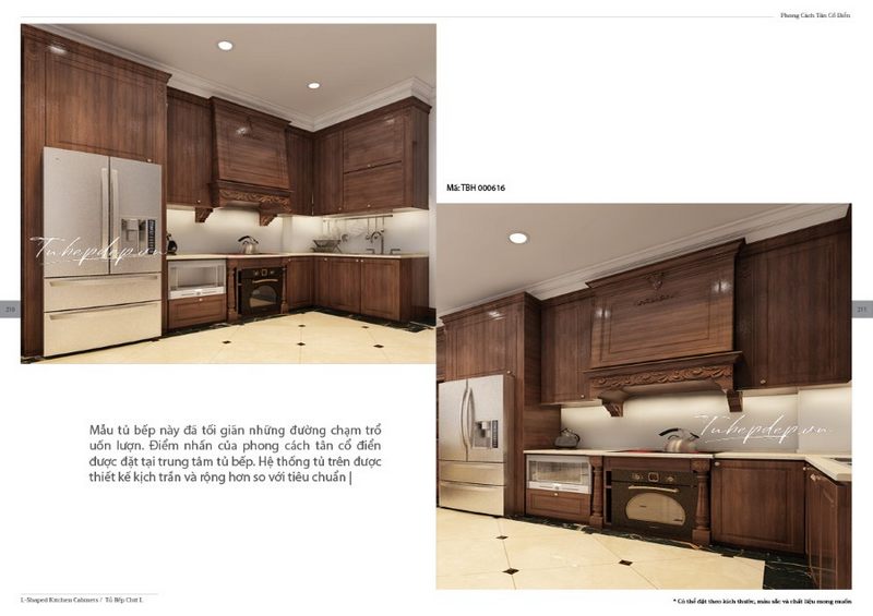 Mẫu tủ bếp mang đậm phong cách tân cổ điển sang trọng, gia chủ đầu tư chất liệu gỗ óc chó nâu trầm đẳng cấp, bền bỉ có các chi tiết điêu khắc đầy nghệ thuật